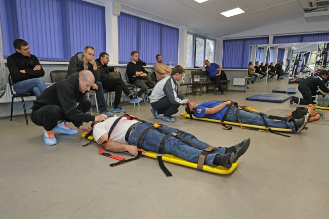 - отработали фиксацию пострадавших на спинальном щите для безопасной транспортировки, методы оказания первой помощи