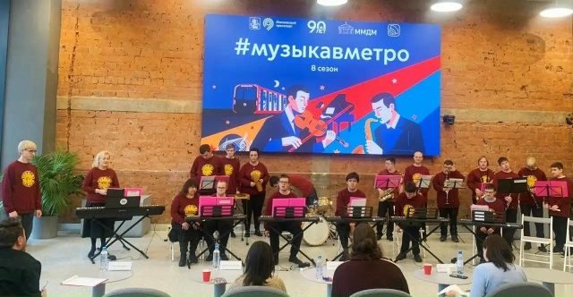 Инклюзивный оркестр «Солнечные нотки» под руководством Татьяны Ореховой выступил в рамках проекта «Музыка в метро». К коллективу присоединились музыкальный руководитель подразделения «Раменки» ГБУ «КРОЦ» О.И. Иванова и девятиклассник центра Николай Иванов.