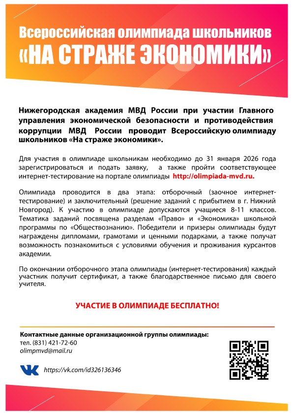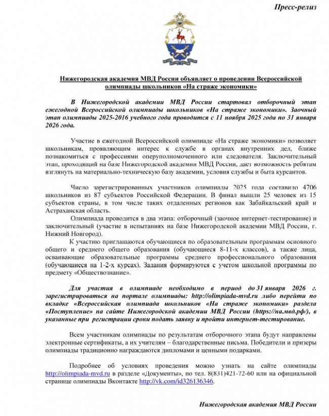 Для участия в олимпиаде необходимо в период до 31 января 2026 года зарегистрироваться на портале олимпиады: http://olimpiada-mvd.ru/, либо перейти по вкладке «Всероссийская олимпиада школьников «На страже экономики» раздела «Поступление» на сайте Нижегородской академии МВД России (https://на.мвд.рф), в указанные при регистрации сроки подать заявку и пройти интернет-тестирование.
