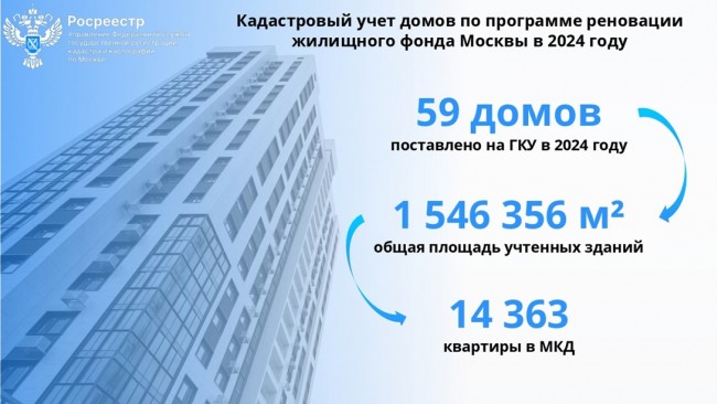 В 2024 году Управлением Росреестра по Москве поставлено на кадастровый учет 59 многоквартирных домов по программе реновации жилищного фонда столицы. Об этом сообщил руководитель Управления Росреестра по Москве Игорь Майданов.