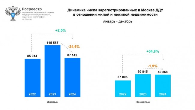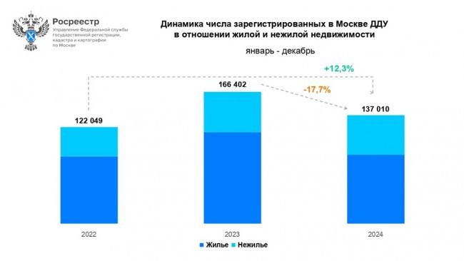 «В 2024 году спрос на московские новостройки оставался стабильным, в среднем ежемесячно регистрировалось свыше 11 тысяч сделок. Несмотря на снижение к рекордному 2023 году, коммерческая недвижимость (49 868 ДДУ) почти достигла уровня предыдущего года, уступив менее 1 тысячи договоров (-1,9%), а вот первичные сделки с квартирами (87 142 ДДУ) сократились почти на четверть (-24,6%). При этом к 2022 году наблюдается положительная динамика: год к году рост числа регистраций как в жилом (+2,5%), так и в нежилом (+34,8%) сегментах», — комментирует Игорь Майданов, руководитель Управления Росреестра по Москве.