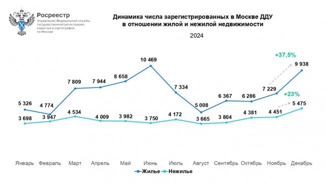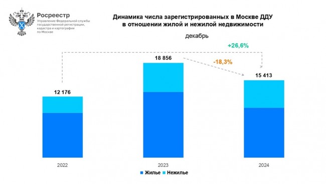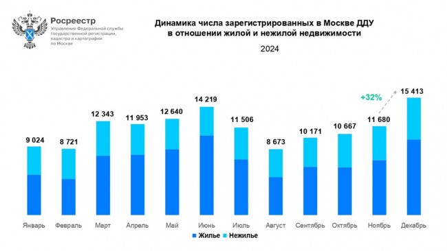 В декабре 2024 года Управлением Росреестра по Москве зарегистрировано 15 413 договоров участия в долевом строительстве в отношении жилой и нежилой недвижимости. Это на 32% больше, чем в ноябре этого же года (11 680 ДДУ).