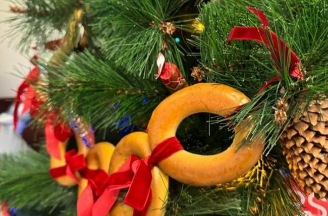 На первом этаже представлена ёлка в народном стиле: её декорировали баранками, петушками, конфетами и самодельными гирляндами.
