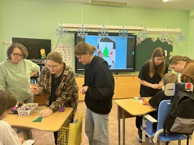 В ходе практики студенты также организуют тематические мероприятия. Совместно с детьми они изготовили новогодние открытки и выполнили рисунки снеговиков — с шарфами, морковками‑носами и улыбками. Готовые работы разместили в групповых помещениях: теперь они дополняют праздничное оформление пространства.