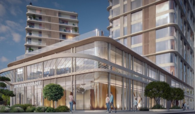 Внешняя территория у стилобата будет благоустроена: там сформируют общественную зону с озеленением. В интерьерах используют современные материалы природных оттенков, натуральное дерево и камень. Фасад облицуют панорамным остеклением, включая моллированные стёкла.