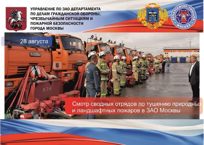 Смотр поливомоечной техники, входящей в состав Сводных отрядов, созданных для усиления группировки сил по тушению природных и ландшафтных пожаров в ТиНАО и ближайшем подмосковье, прошел сегодня, 28 августа, в Западном округе столицы.