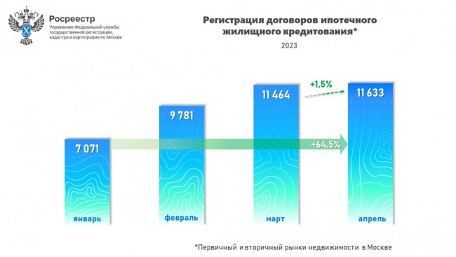 В апреле 2023 года Управлением Росреестра по Москве на первичном и вторичном рынках столичной недвижимости зарегистрировано 11 633 договора ипотечного жилищного кредитования. Данный показатель на 1,5% превысил результат предыдущего месяца (11 464).